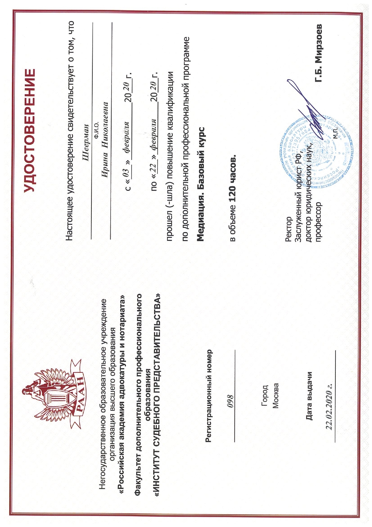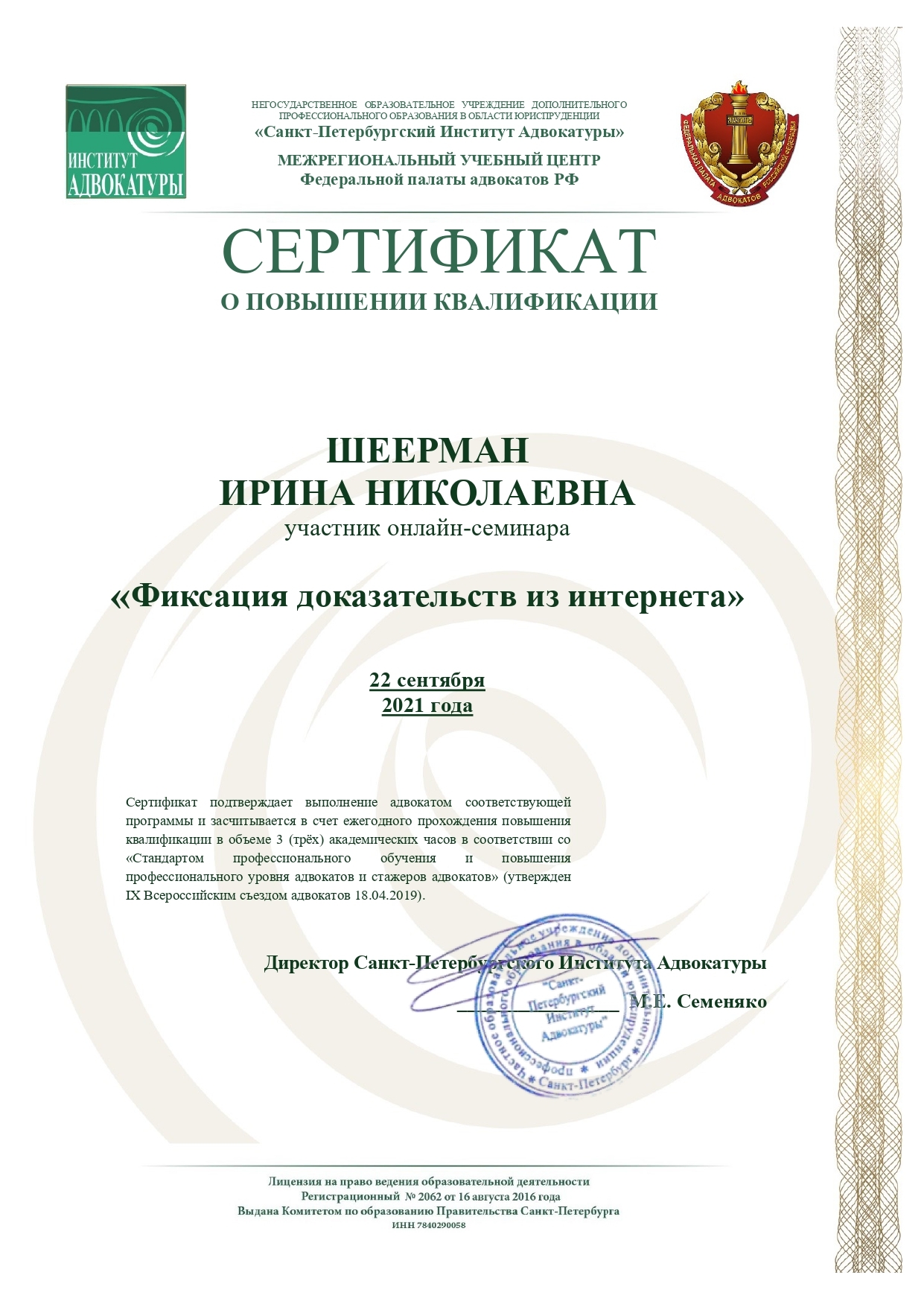 Регистрационный номер в реестре адвокатов № 77/15778, член Адвокатской палаты города Москвы